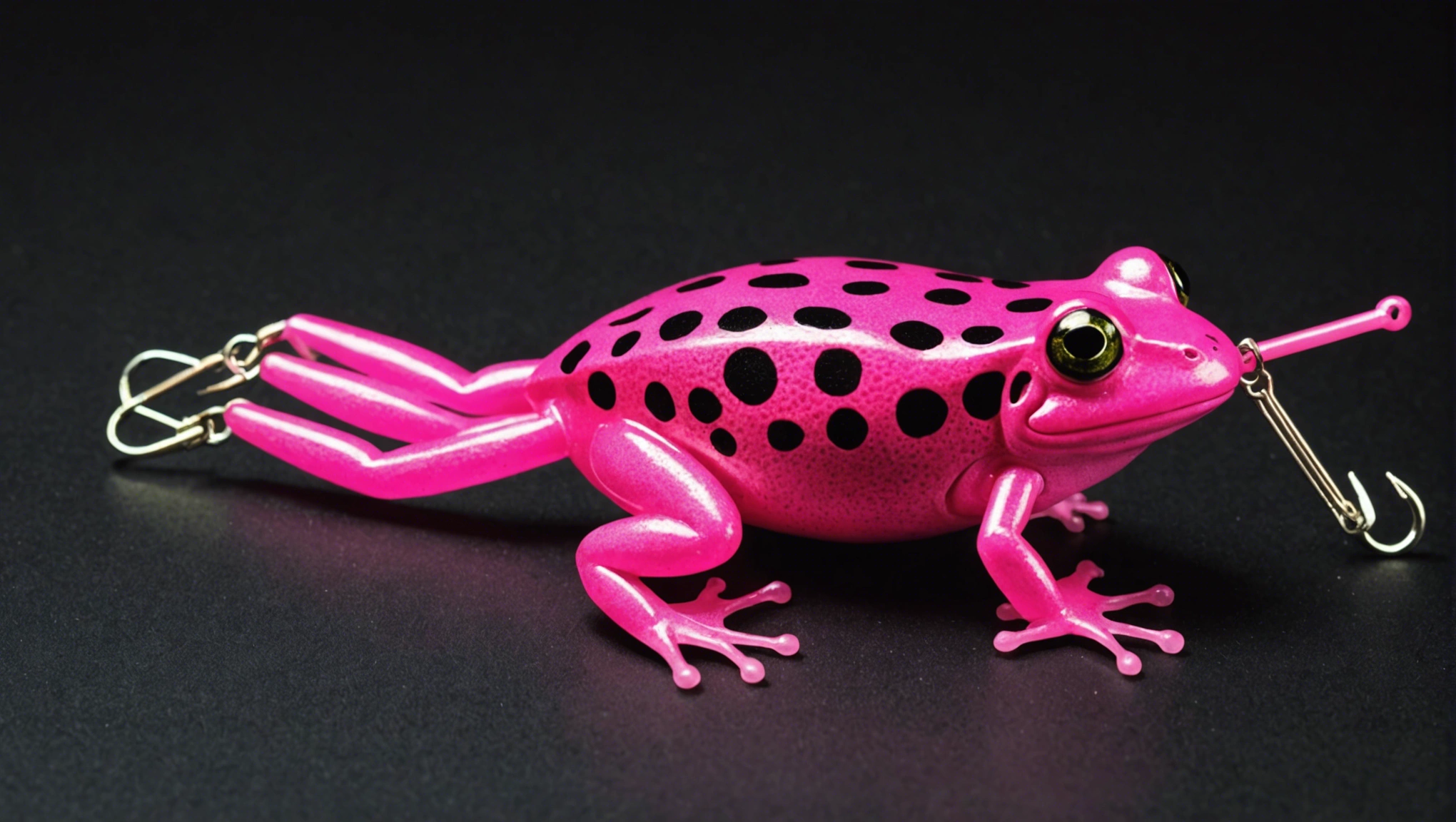 Fishing lure with fishing hooks like (((Pink Frog))). A studio shot masterpiece lure product photo centered on a (black background).