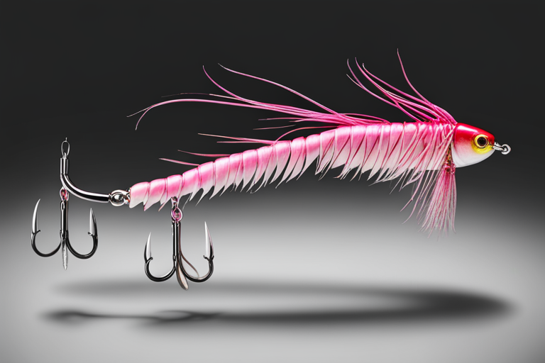 Stable Diffusion AI Prompt Fishing lure precisely mimics the exact shape and colors of a (((Pink Grub))). A panoramic studio shot of the highly detailed Pink colored ((Grub-shaped)) fishing lure with treble hooks designed to catch fish, centered product photography. A masterpiece product photo on a (black background).