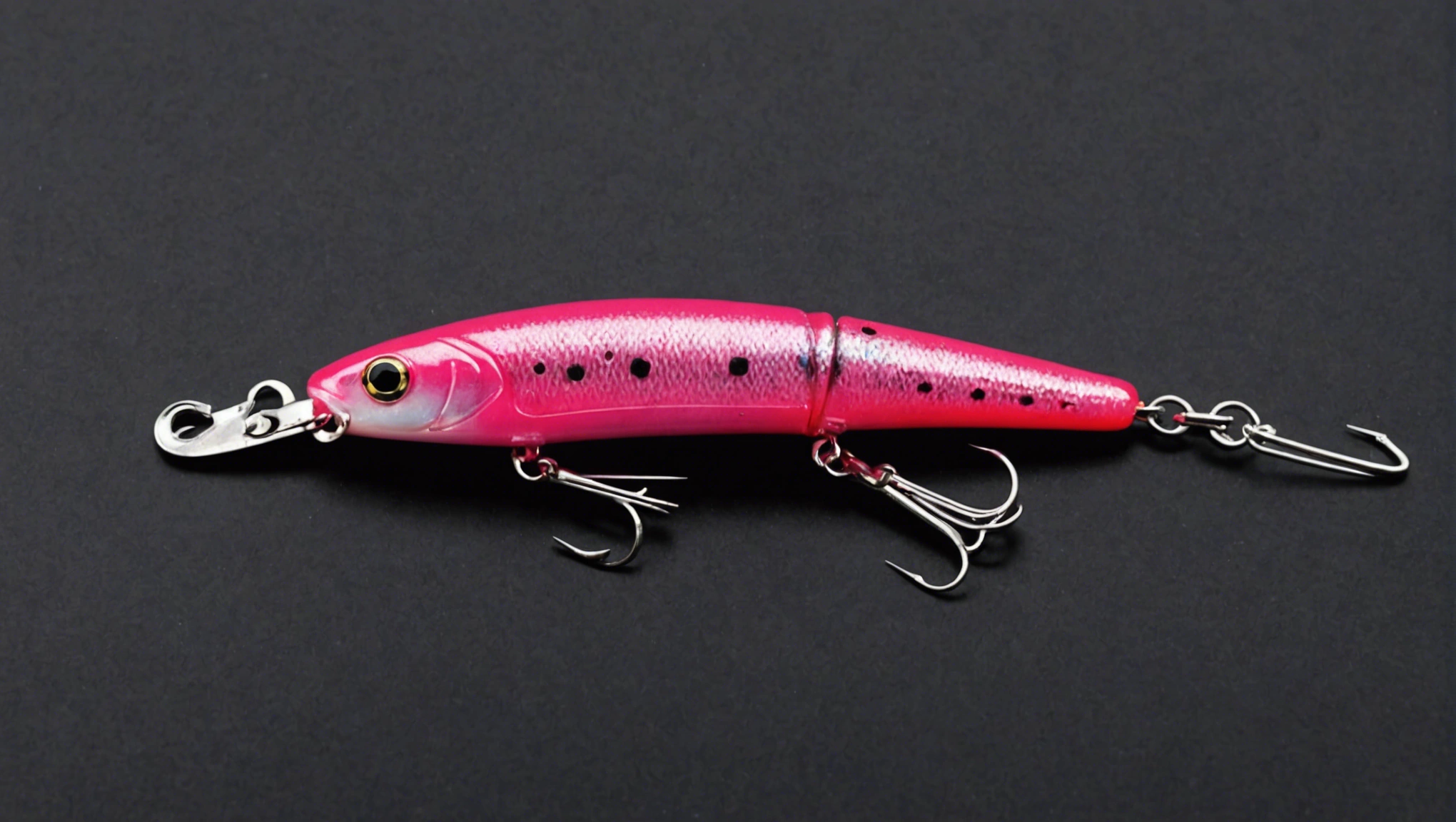 Fishing lure with fishing hooks like (((Pink Nothing))). A studio shot masterpiece lure product photo centered on a (black background).