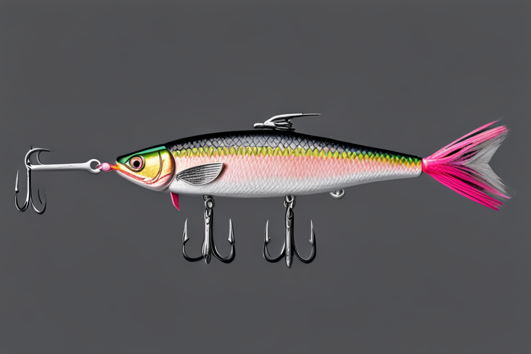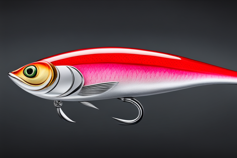 Stable Diffusion AI Prompt Fishing lure precisely mimics the exact shape and colors of a (((Pink salmon))). A panoramic studio shot of the highly detailed Pink colored ((salmon-shaped)) fishing lure with treble hooks designed to catch fish, centered product photography. A masterpiece product photo on a (black background).