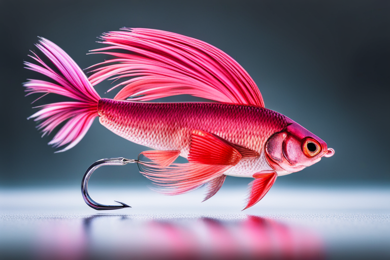 Stable Diffusion AI Prompt Fishing lure precisely mimics the exact shape and colors of a (((Pink Siamese Fish))). A panoramic studio shot of the highly detailed Pink colored ((Siamese Fish-shaped)) fishing lure with treble hooks designed to catch fish, centered product photography. A masterpiece product photo on a (black background).