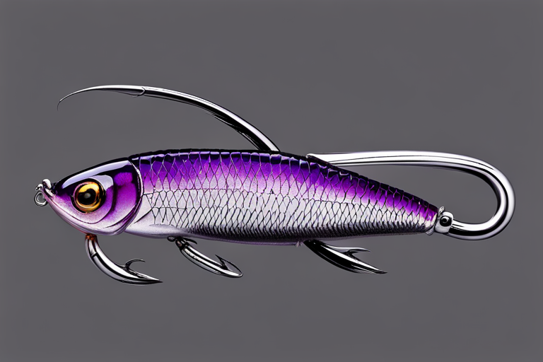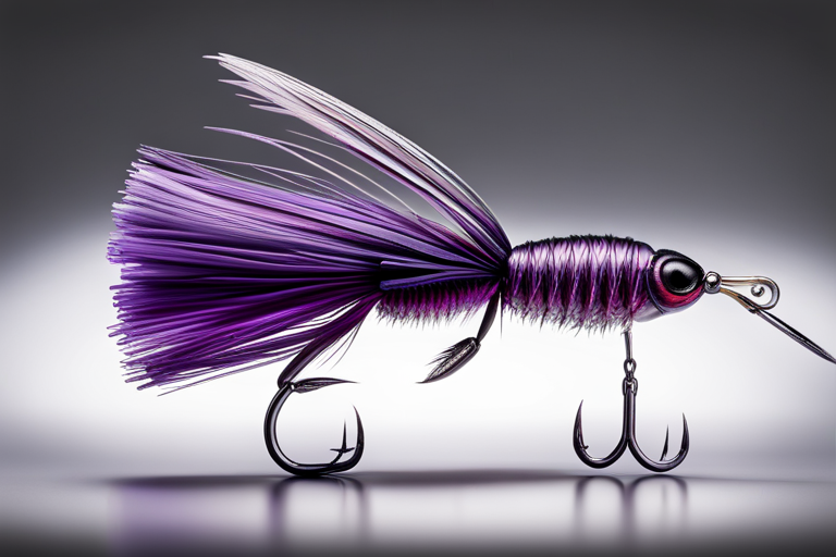 Stable Diffusion AI Prompt Fishing lure precisely mimics the exact shape and colors of a (((Purple Bay Bug))). A panoramic studio shot of the highly detailed Purple colored ((Bay Bug-shaped)) fishing lure with treble hooks designed to catch fish, centered product photography. A masterpiece product photo on a (black background).