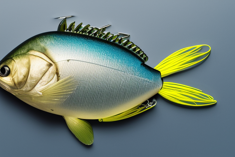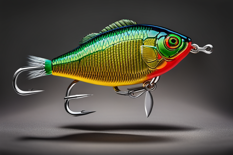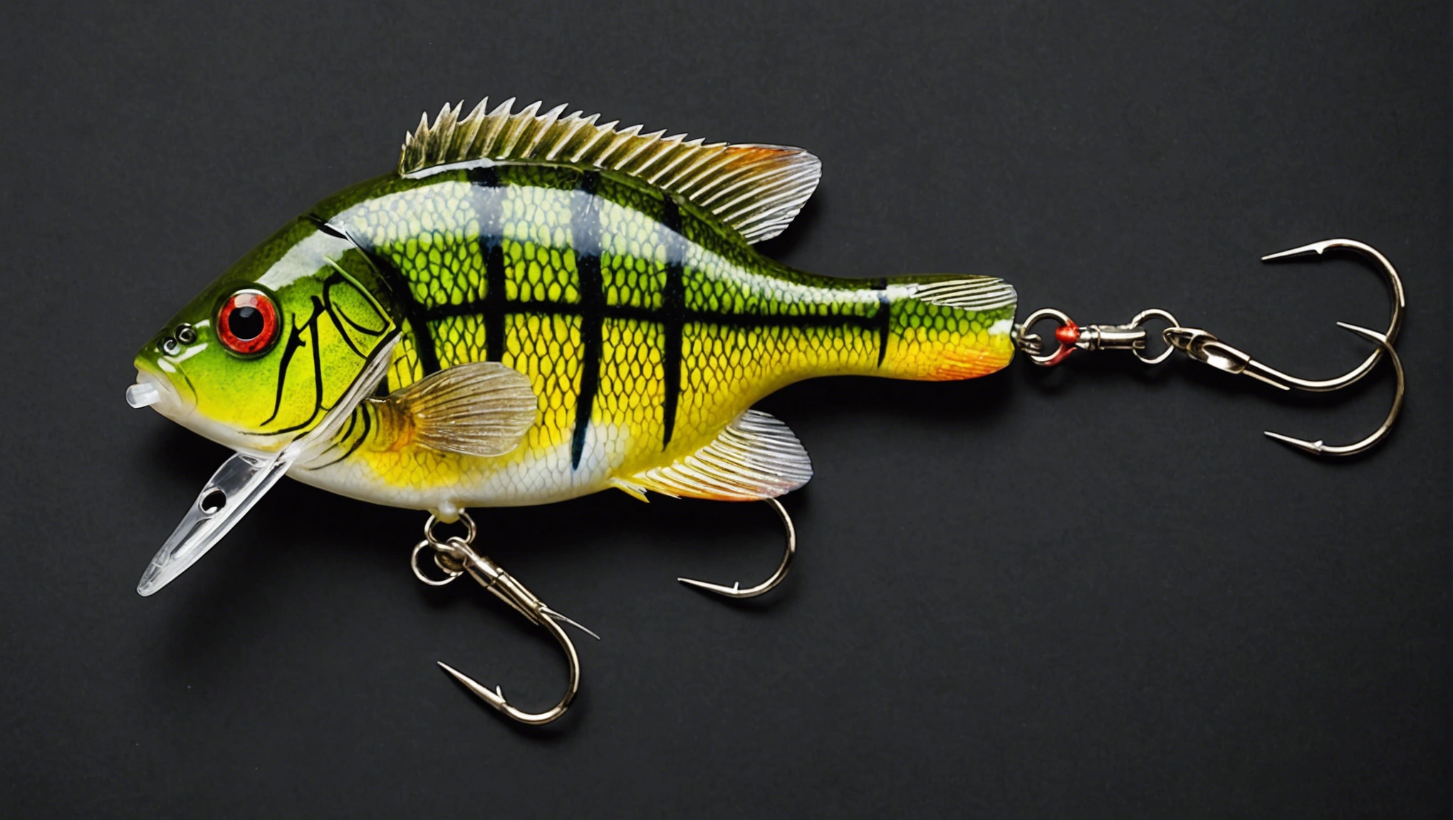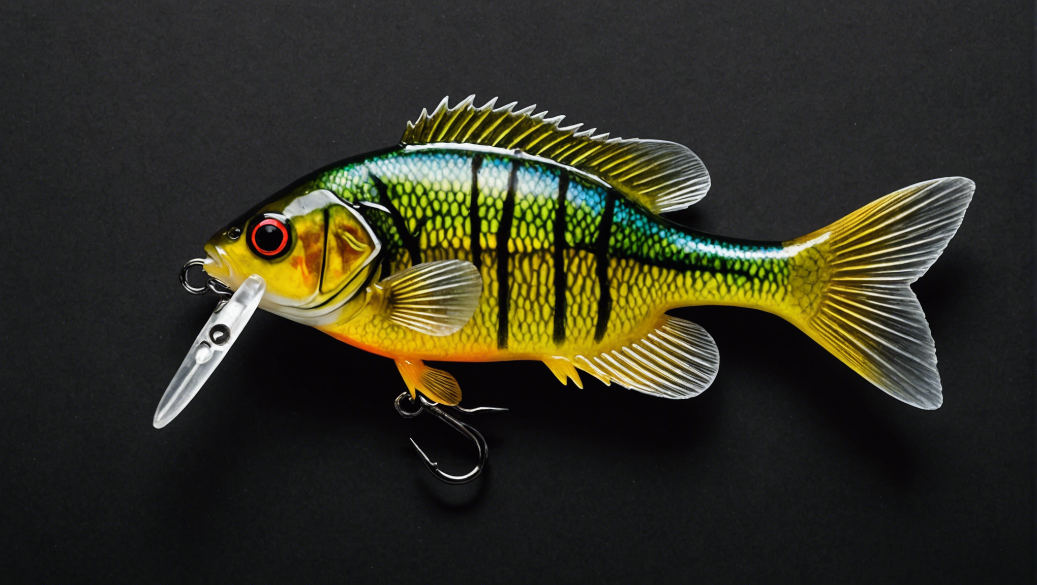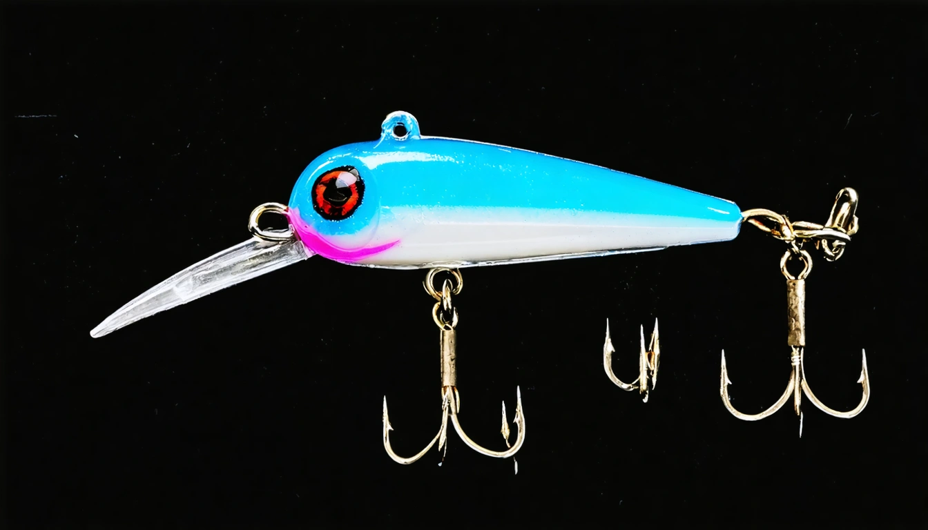 Stable Diffusion AI Prompt Fishing lure precisely mimics the exact shape and colors of a (((Purple Bluegill))). A panoramic studio shot of the highly detailed Purple colored ((Bluegill-shaped)) fishing lure with treble hooks designed to catch fish, centered product photography. A masterpiece product photo on a (black background).