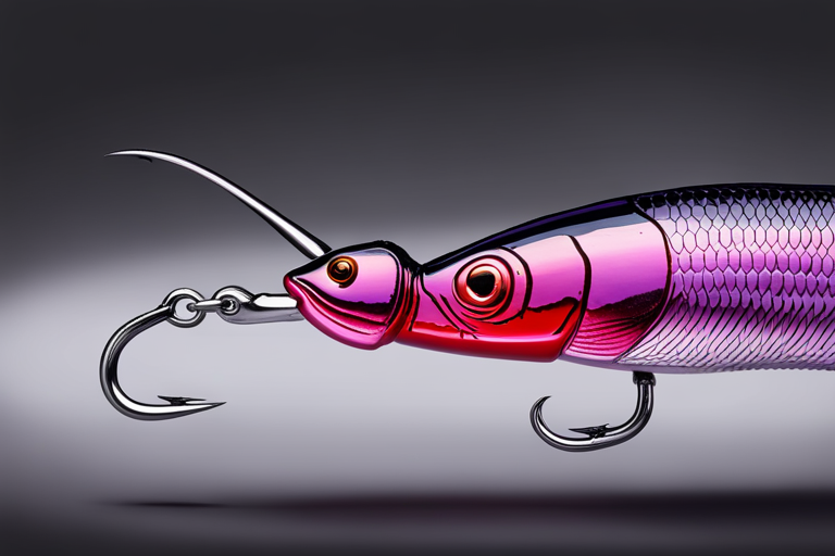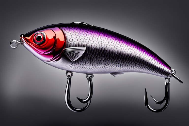 Stable Diffusion AI Prompt Fishing lure precisely mimics the exact shape and colors of a (((Purple carp))). A panoramic studio shot of the highly detailed Purple colored ((carp-shaped)) fishing lure with treble hooks designed to catch fish, centered product photography. A masterpiece product photo on a (black background).