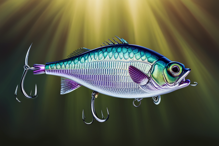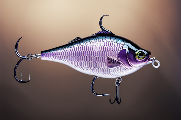 Stable Diffusion AI Prompt Fishing lure precisely mimics the exact (((shape and colors of a Purple Crappie))). A panoramic studio shot of the highly detailed conceptual Crappie-shaped fishing lure designed to catch fish, centered in the image. It has treble hooks and is Purple in color. The lure is lit with diffused lighting against a plain dark background. A masterpiece product photo by photographer Jovana Rikalo.