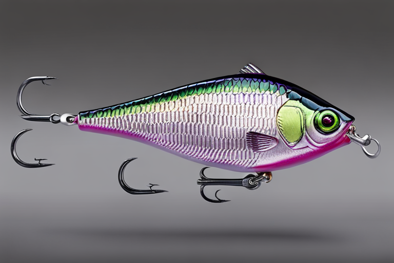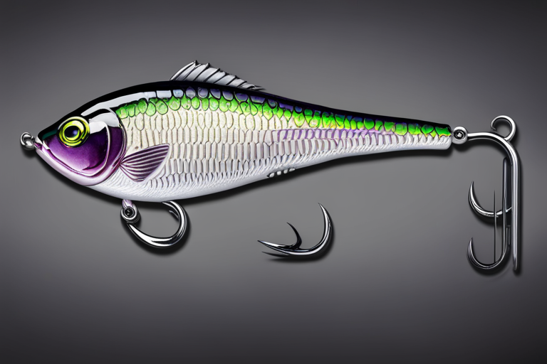 Stable Diffusion AI Prompt Fishing lure precisely mimics the exact shape and colors of a (((Purple Crappie))). A panoramic studio shot of the highly detailed Purple colored ((Crappie-shaped)) fishing lure with treble hooks designed to catch fish, centered product photography. A masterpiece product photo on a (black background).
