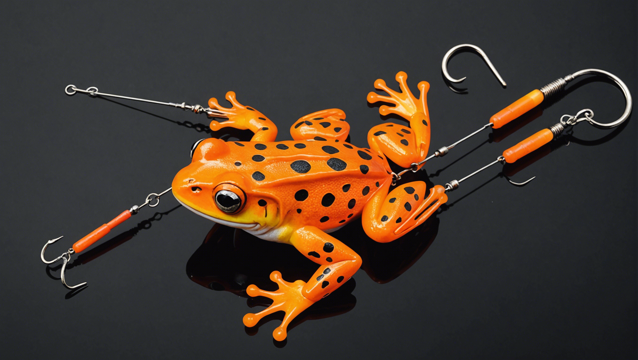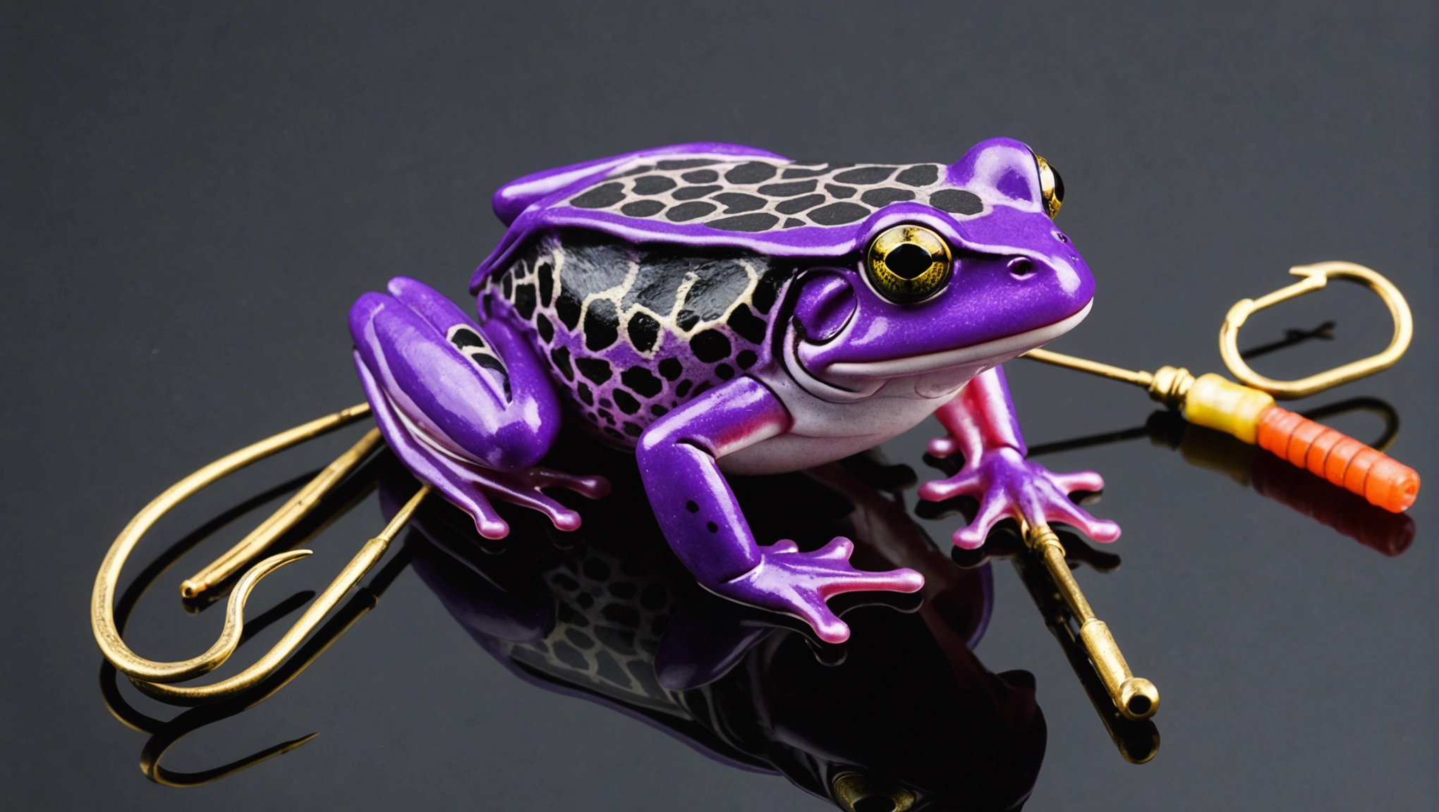 Fishing lure with fishing hooks like (((Purple Frog))). A studio shot masterpiece lure product photo centered on a (black background).