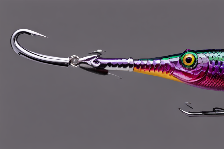 Stable Diffusion AI Prompt Fishing lure precisely mimics the exact shape and colors of a (((Purple Lizard))). A panoramic studio shot of the highly detailed Purple colored ((Lizard-shaped)) fishing lure with treble hooks designed to catch fish, centered product photography. A masterpiece product photo on a (black background).