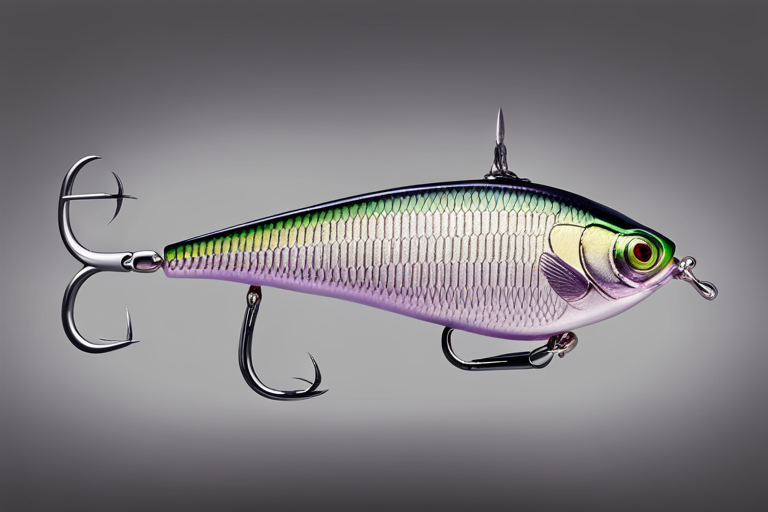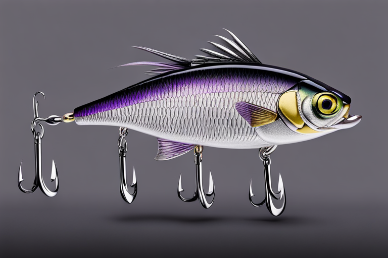 Stable Diffusion AI Prompt Fishing lure precisely mimics the exact shape and colors of a (((Purple Perch))). A panoramic studio shot of the highly detailed Purple colored ((Perch-shaped)) fishing lure with treble hooks designed to catch fish, centered product photography. A masterpiece product photo on a (black background).