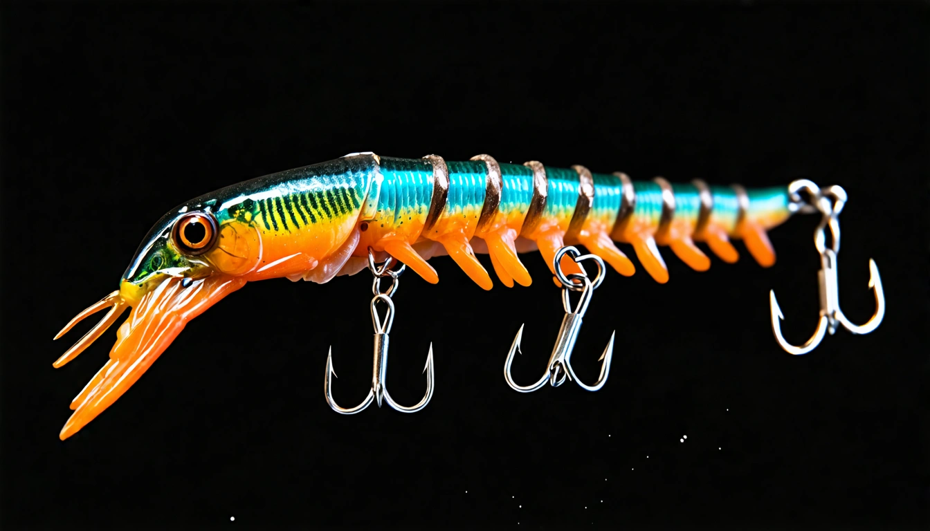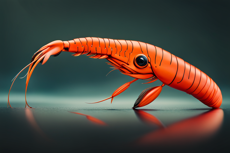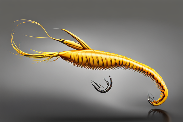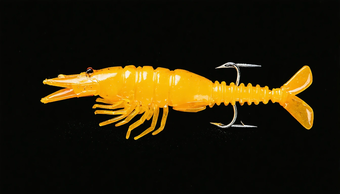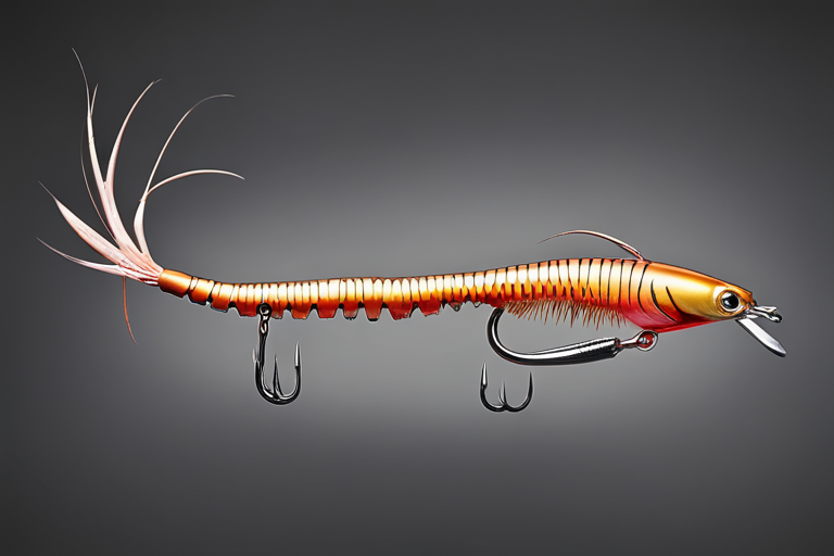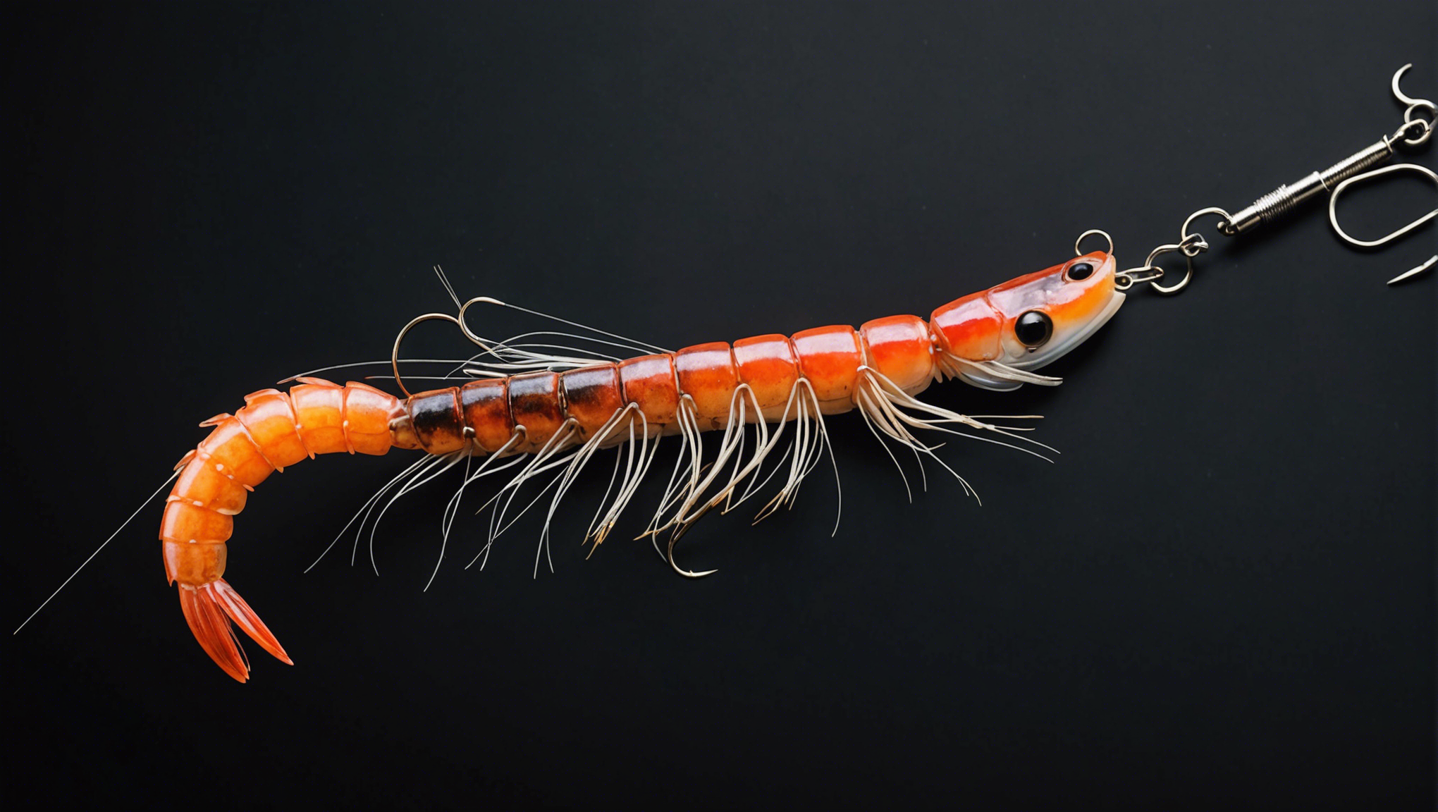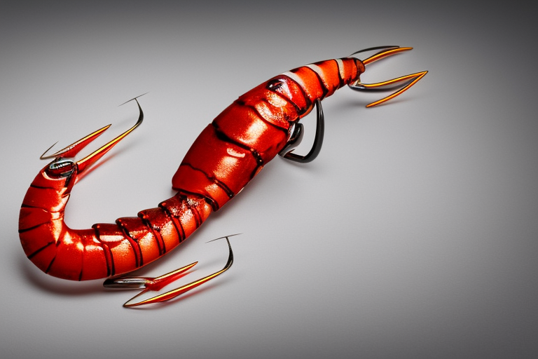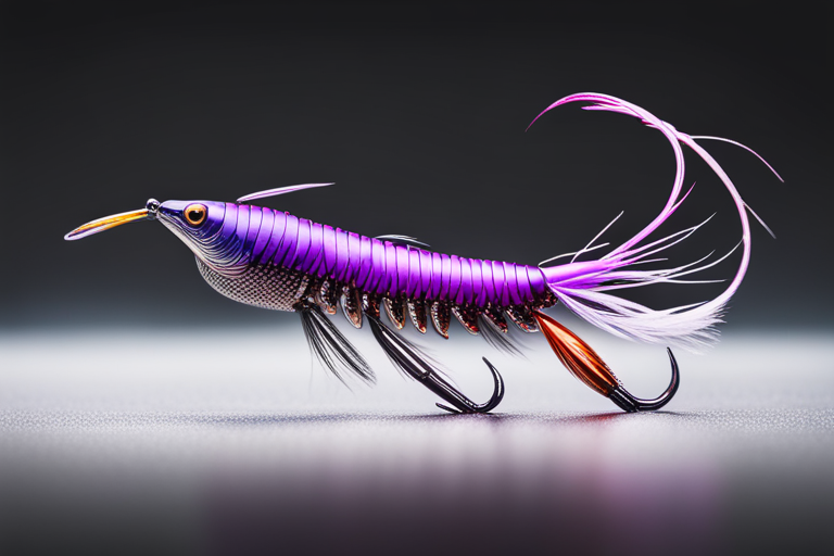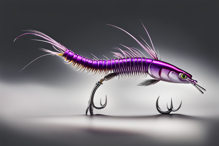Stable Diffusion AI Prompt Fishing lure precisely mimics the exact shape and colors of a (((Purple Prawn))). A panoramic studio shot of the highly detailed Purple colored ((Prawn-shaped)) fishing lure with treble hooks designed to catch fish, centered product photography. A masterpiece product photo on a (black background).