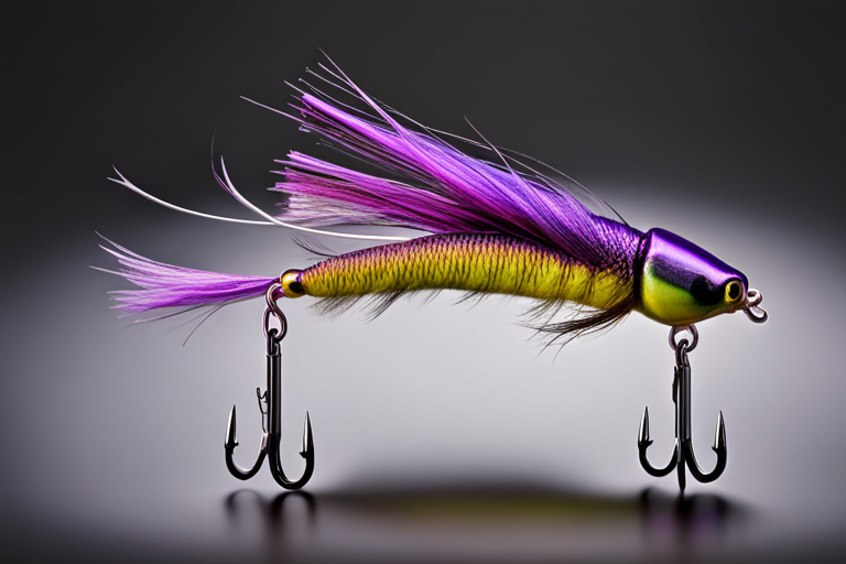 Stable Diffusion AI Prompt Fishing lure precisely mimics the exact shape and colors of a (((Purple Rodent))). A panoramic studio shot of the highly detailed Purple colored ((Rodent-shaped)) fishing lure with treble hooks designed to catch fish, centered product photography. A masterpiece product photo on a (black background).