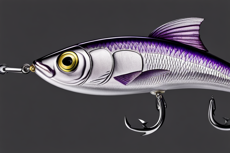 Stable Diffusion AI Prompt Fishing lure precisely mimics the exact shape and colors of a (((Purple Shad))). A panoramic studio shot of the highly detailed Purple colored ((Shad-shaped)) fishing lure with treble hooks designed to catch fish, centered product photography. A masterpiece product photo on a (black background).