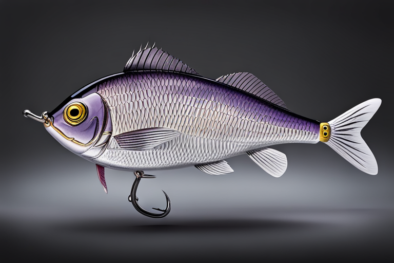 Stable Diffusion AI Prompt Fishing lure precisely mimics the exact shape and colors of a (((Purple Sunfish))). A panoramic studio shot of the highly detailed Purple colored ((Sunfish-shaped)) fishing lure with treble hooks designed to catch fish, centered product photography. A masterpiece product photo on a (black background).