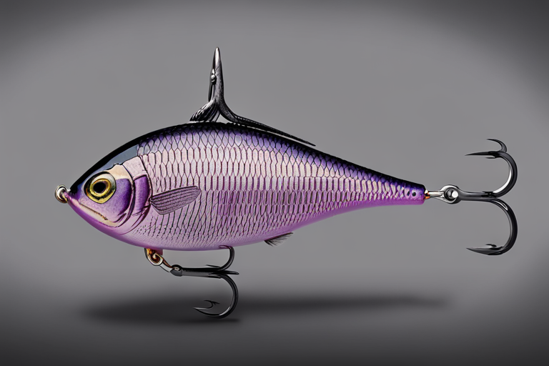 Stable Diffusion AI Prompt Fishing lure precisely mimics the exact shape and colors of a (((Purple Sunfish))). A panoramic studio shot of the highly detailed Purple colored ((Sunfish-shaped)) fishing lure with treble hooks designed to catch fish, centered product photography. A masterpiece product photo on a (black background).