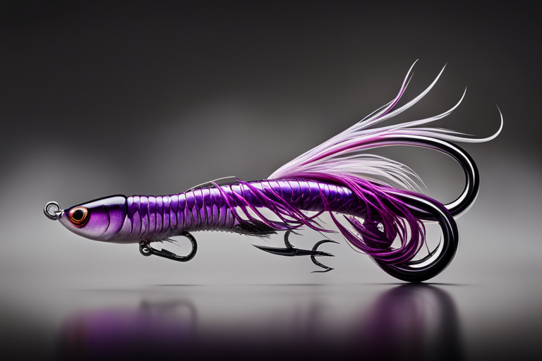 Stable Diffusion AI Prompt Fishing lure precisely mimics the exact shape and colors of a (((Purple Worm))). A panoramic studio shot of the highly detailed Purple colored ((Worm-shaped)) fishing lure with treble hooks designed to catch fish, centered product photography. A masterpiece product photo on a (black background).