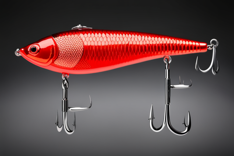 Stable Diffusion AI Prompt Fishing lure precisely mimics the exact shape and colors of a (((red Bass))). A panoramic studio shot of the highly detailed red colored ((Bass-shaped)) fishing lure with treble hooks designed to catch fish, centered product photography. A masterpiece product photo on a (black background).
