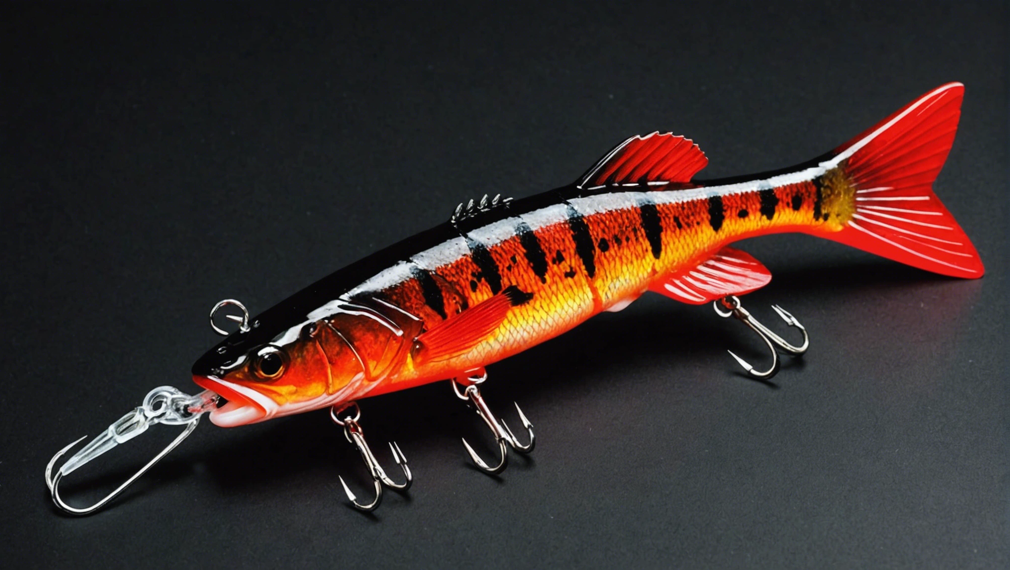 Fishing lure with fishing hooks like (((Red Bass))). A studio shot masterpiece lure product photo centered on a (black background).