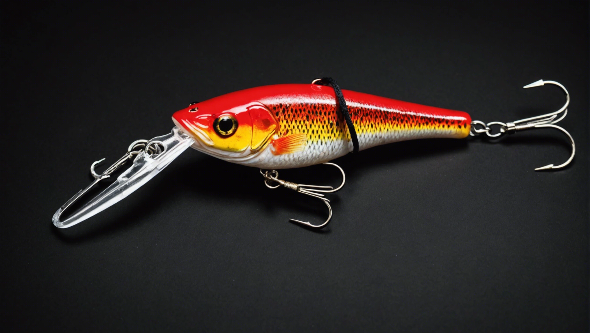 Fishing lure with fishing hooks like (((Red Bass))). A studio shot masterpiece lure product photo centered on a (black background).