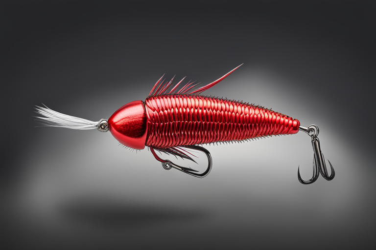 Stable Diffusion AI Prompt Fishing lure precisely mimics the exact shape and colors of a (((Red Beetle))). A panoramic studio shot of the highly detailed Red colored ((Beetle-shaped)) fishing lure with treble hooks designed to catch fish, centered product photography. A masterpiece product photo on a (black background).