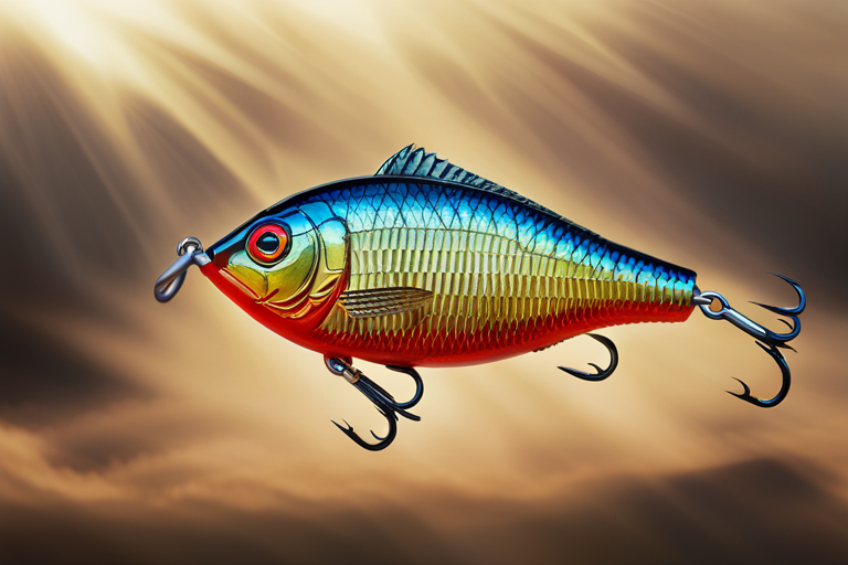 Stable Diffusion AI Prompt Fishing lure precisely mimics the exact (((shape and colors of a Red Bluegill))). A panoramic studio shot of the highly detailed conceptual Bluegill-shaped fishing lure designed to catch fish, centered in the image. It has treble hooks and is Red in color. The lure is lit with diffused lighting against a plain dark background. A masterpiece product photo by photographer Jovana Rikalo.