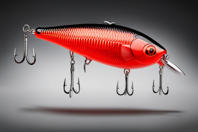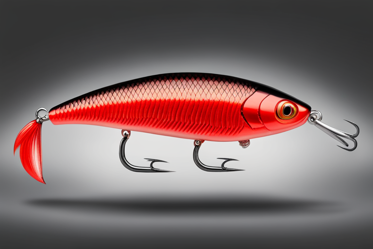 Stable Diffusion AI Prompt Fishing lure precisely mimics the exact shape and colors of a (((Red chub))). A panoramic studio shot of the highly detailed Red colored ((chub-shaped)) fishing lure with treble hooks designed to catch fish, centered product photography. A masterpiece product photo on a (black background).