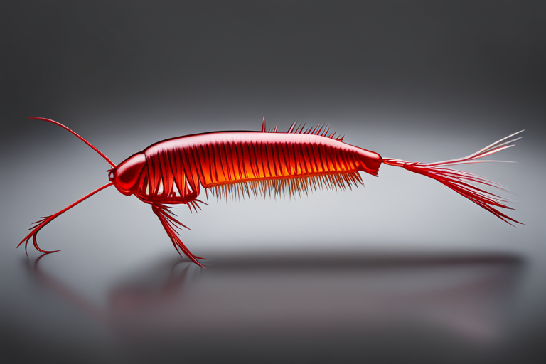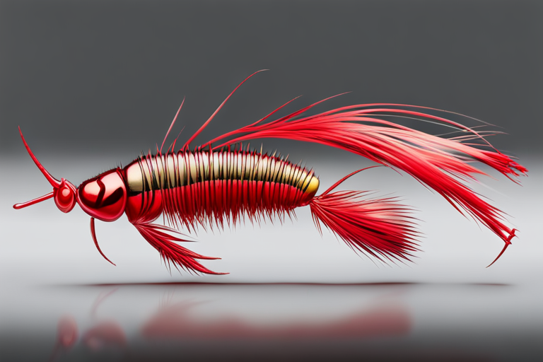 Stable Diffusion AI Prompt Fishing lure precisely mimics the exact shape and colors of a (((Red Cockroach))). A panoramic studio shot of the highly detailed Red colored ((Cockroach-shaped)) fishing lure with treble hooks designed to catch fish, centered product photography. A masterpiece product photo on a (black background).