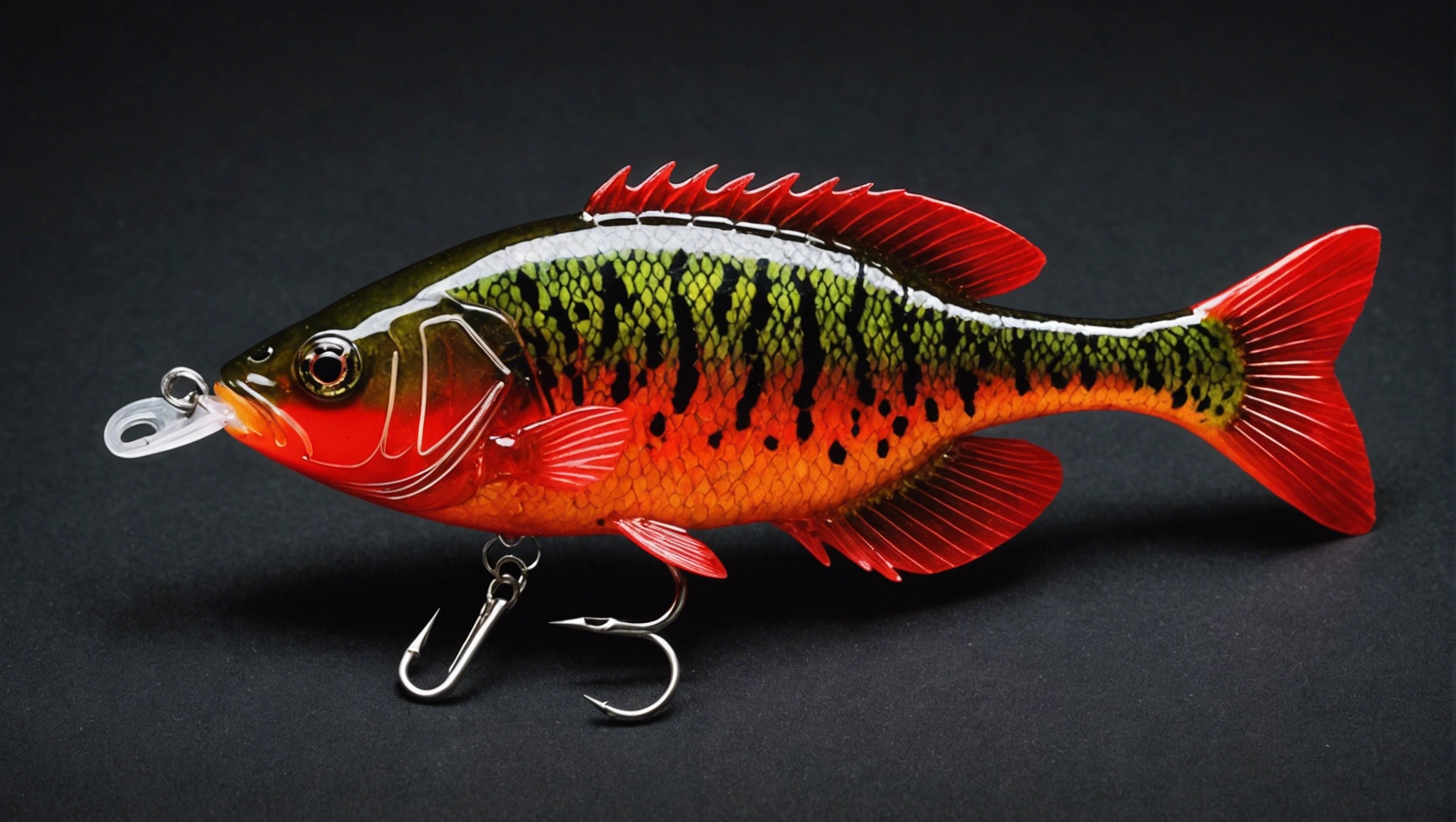 Fishing lure with fishing hooks like (((Red Crappie))). A studio shot masterpiece lure product photo centered on a (black background).