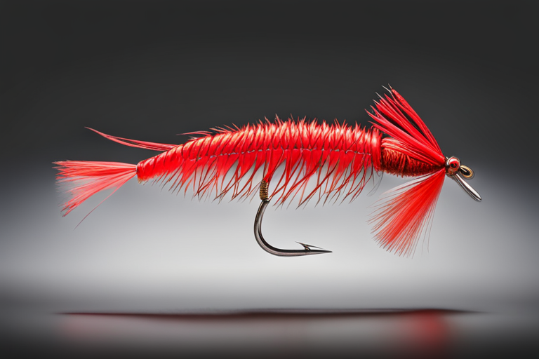 Stable Diffusion AI Prompt Fishing lure precisely mimics the exact shape and colors of a (((Red Fly))). A panoramic studio shot of the highly detailed Red colored ((Fly-shaped)) fishing lure with treble hooks designed to catch fish, centered product photography. A masterpiece product photo on a (black background).