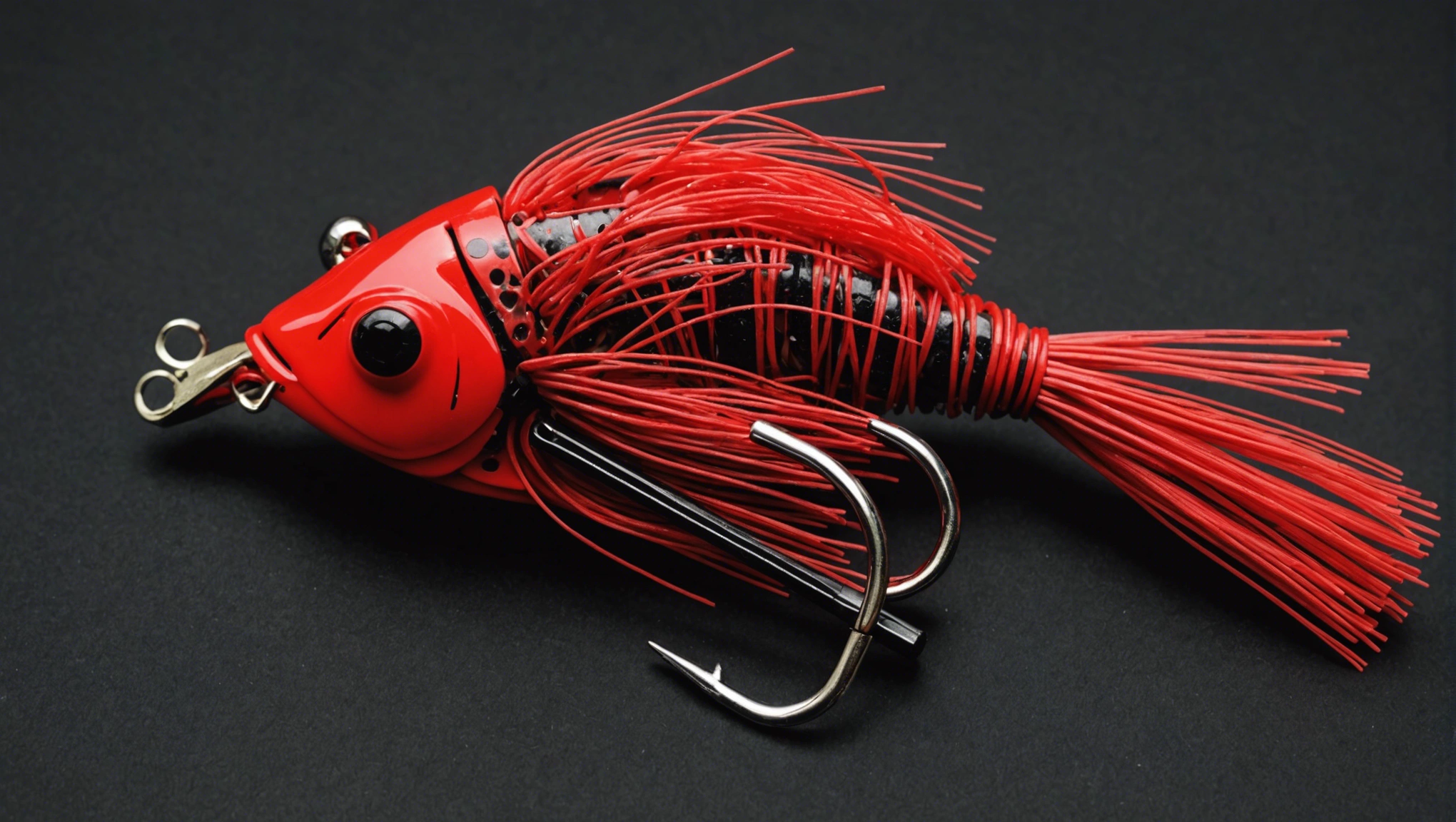 Fishing lure with fishing hooks like (((Red Football jig with a crawl for bass))). A studio shot masterpiece lure product photo centered on a (black background).