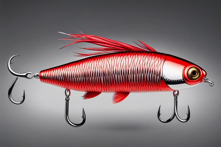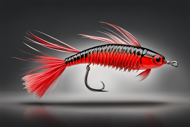 Stable Diffusion AI Prompt Fishing lure precisely mimics the exact shape and colors of a (((Red Grub))). A panoramic studio shot of the highly detailed Red colored ((Grub-shaped)) fishing lure with treble hooks designed to catch fish, centered product photography. A masterpiece product photo on a (black background).