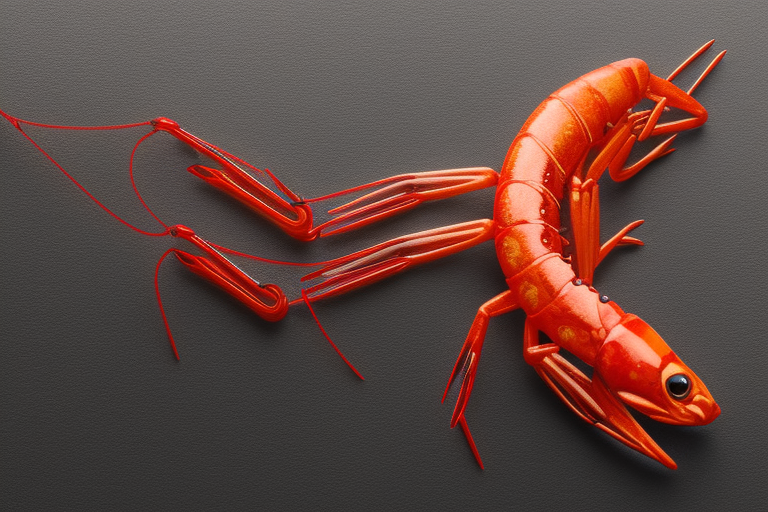 Stable Diffusion AI Prompt product photography of a fishing lure with hooks that looks like a Red colored Prawn!!!, (anatomically correct), futuristic, uhd, highly detailed, concept, product studio shot, panoramic shot, centered!!!, diffused lighting on a plain dark background, highly detailed, masterpiece, product photography by Wlop and Jovana Rikalo