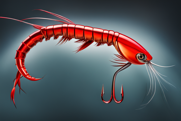 Stable Diffusion AI Prompt Fishing lure precisely mimics the exact shape and colors of a (((Red Prawn))). A panoramic studio shot of the highly detailed Red colored ((Prawn-shaped)) fishing lure with treble hooks designed to catch fish, centered product photography. A masterpiece product photo on a (black background).