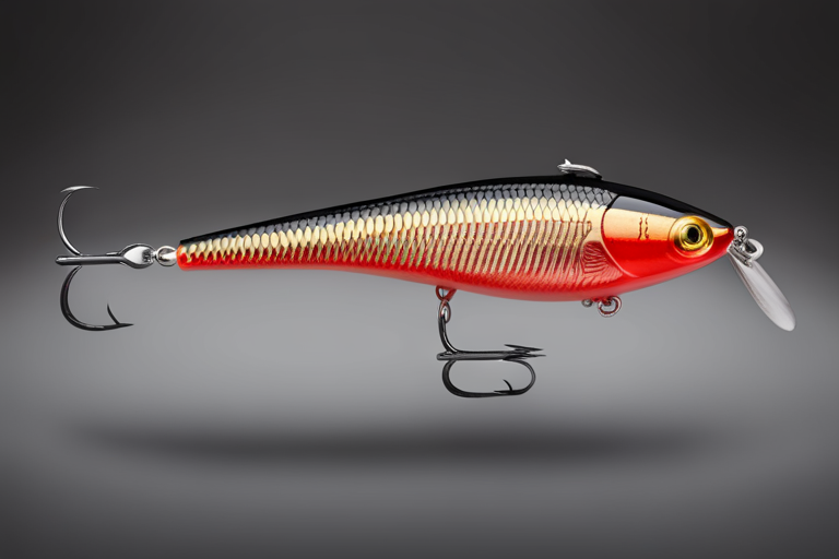Stable Diffusion AI Prompt Fishing lure precisely mimics the exact shape and colors of a (((Red Shad))). A panoramic studio shot of the highly detailed Red colored ((Shad-shaped)) fishing lure with treble hooks designed to catch fish, centered product photography. A masterpiece product photo on a (black background).