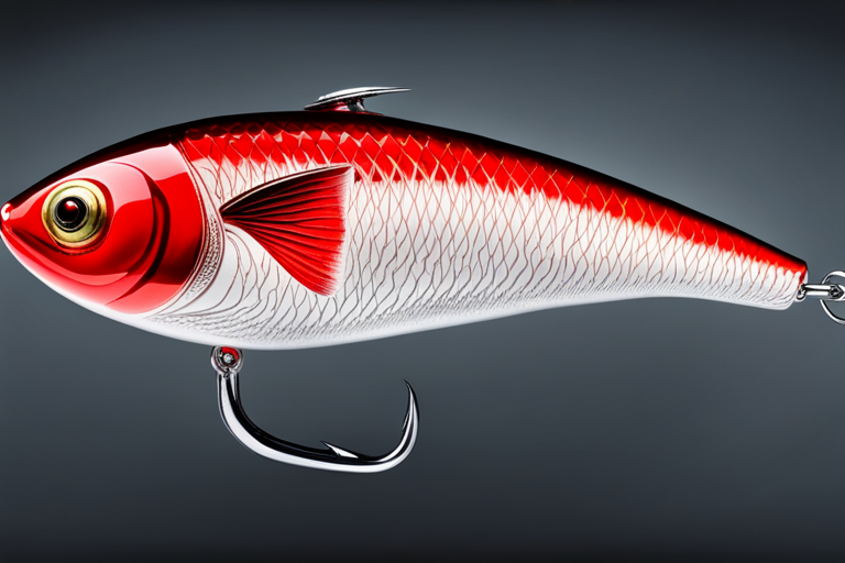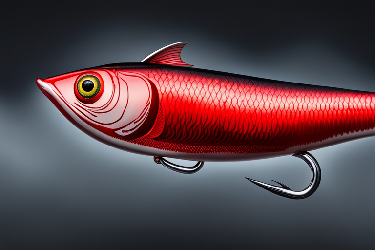 Stable Diffusion AI Prompt Fishing lure precisely mimics the exact shape and colors of a (((Red Shad))). A panoramic studio shot of the highly detailed Red colored ((Shad-shaped)) fishing lure with treble hooks designed to catch fish, centered product photography. A masterpiece product photo on a (black background).
