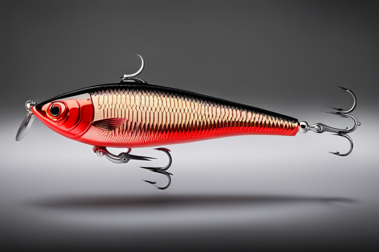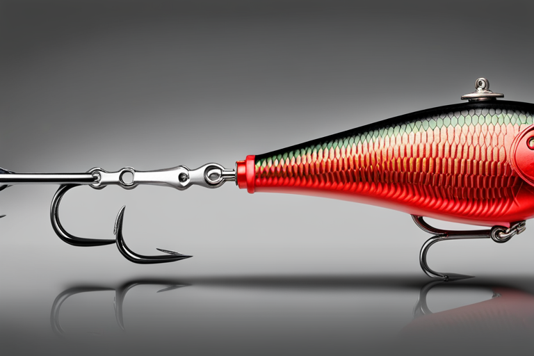 Stable Diffusion AI Prompt Fishing lure precisely mimics the exact shape and colors of a (((Red Shad))). A panoramic studio shot of the highly detailed Red colored ((Shad-shaped)) fishing lure with treble hooks designed to catch fish, centered product photography. A masterpiece product photo on a (black background).