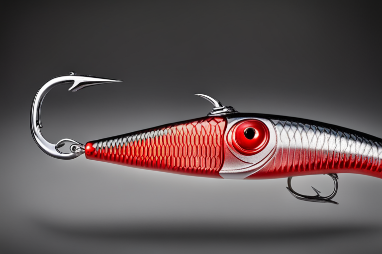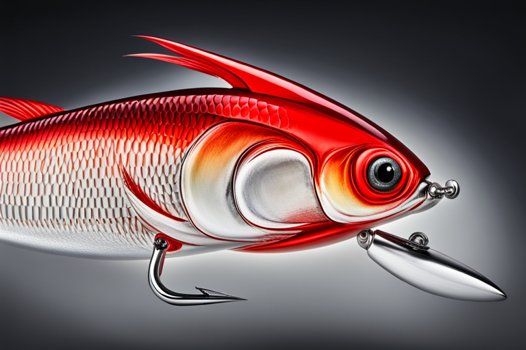 Stable Diffusion AI Prompt Fishing lure precisely mimics the exact shape and colors of a (((Red Shad))). A panoramic studio shot of the highly detailed Red colored ((Shad-shaped)) fishing lure with treble hooks designed to catch fish, centered product photography. A masterpiece product photo on a (black background).