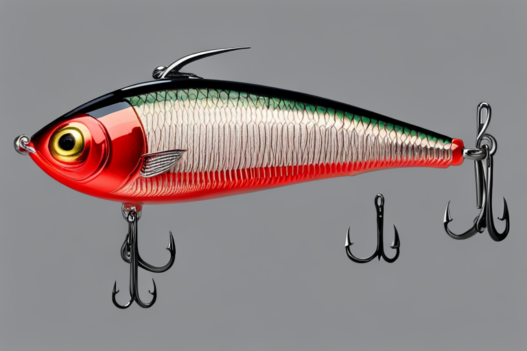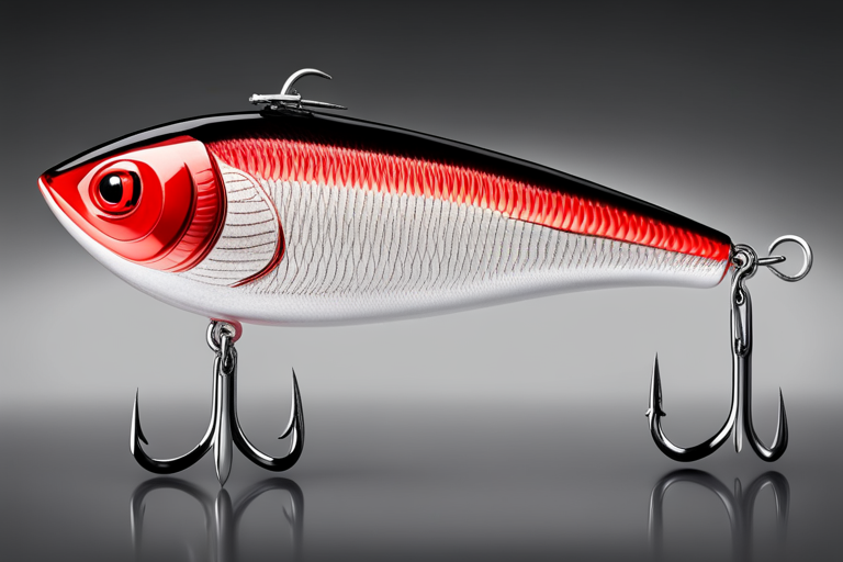 Stable Diffusion AI Prompt Fishing lure precisely mimics the exact shape and colors of a (((Red Shad))). A panoramic studio shot of the highly detailed Red colored ((Shad-shaped)) fishing lure with treble hooks designed to catch fish, centered product photography. A masterpiece product photo on a (black background).