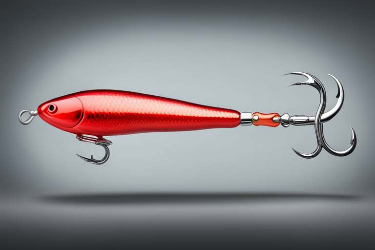 Stable Diffusion AI Prompt Fishing lure precisely mimics the exact shape and colors of a (((Red Squid))). A panoramic studio shot of the highly detailed Red colored ((Squid-shaped)) fishing lure with treble hooks designed to catch fish, centered product photography. A masterpiece product photo on a (black background).