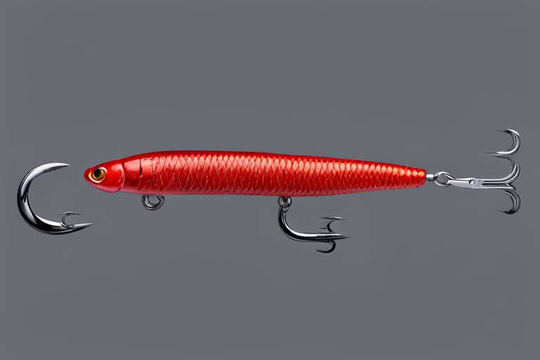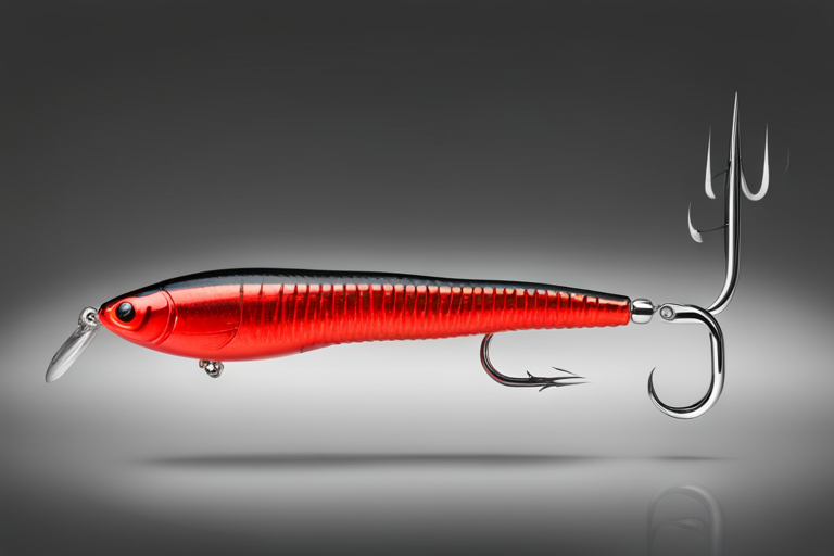Stable Diffusion AI Prompt Fishing lure precisely mimics the exact shape and colors of a (((Red Worm))). A panoramic studio shot of the highly detailed Red colored ((Worm-shaped)) fishing lure with treble hooks designed to catch fish, centered product photography. A masterpiece product photo on a (black background).