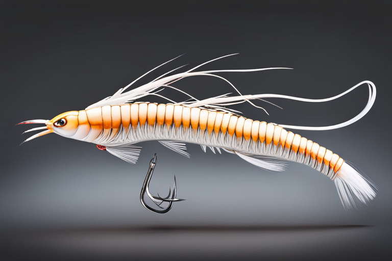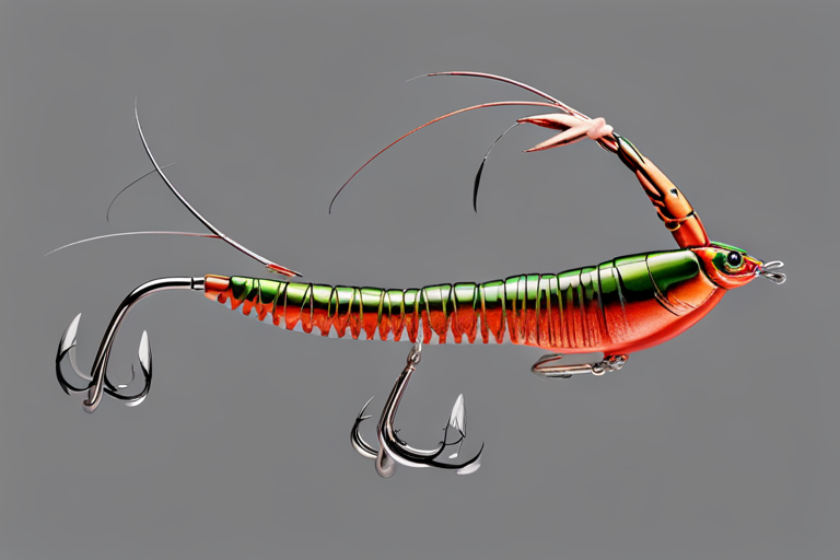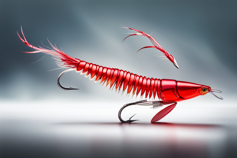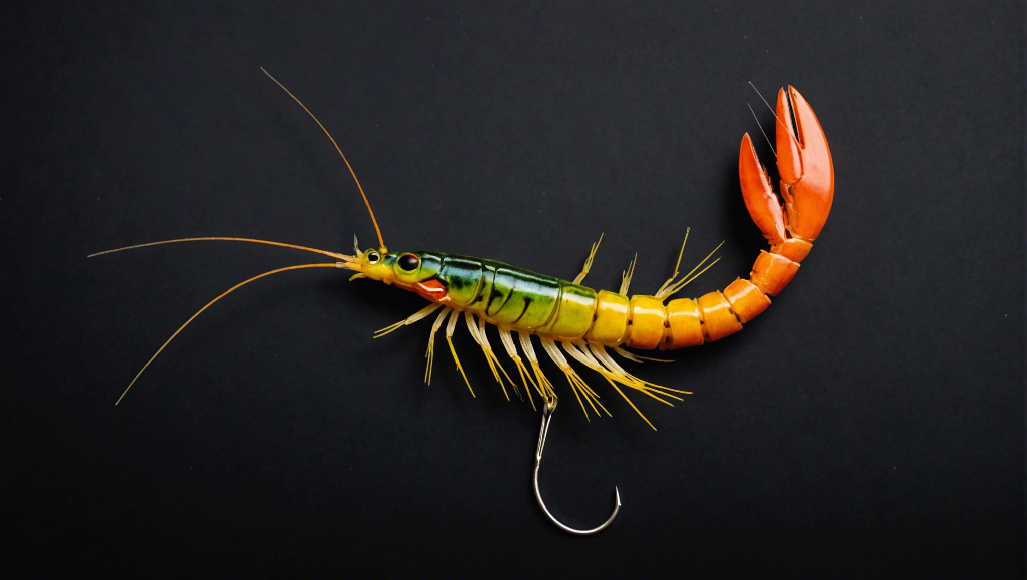 Fishing lure with fishing hooks like (((senape prawn))). A studio shot masterpiece lure product photo centered on a (black background).