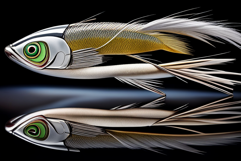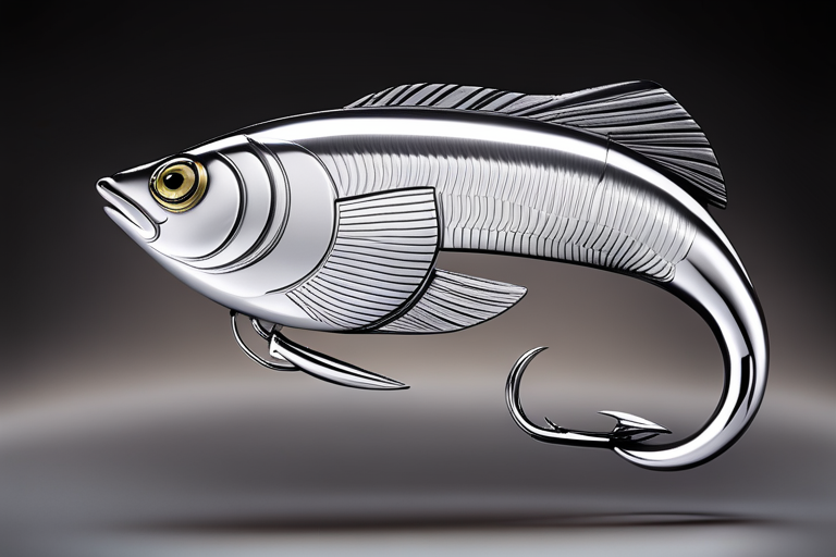 Stable Diffusion AI Prompt Fishing lure precisely mimics the exact shape and colors of a (((Silver Bass))). A panoramic studio shot of the highly detailed Silver colored ((Bass-shaped)) fishing lure with treble hooks designed to catch fish, centered product photography. A masterpiece product photo on a (black background).