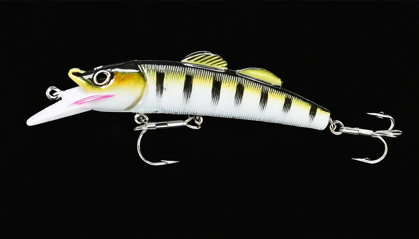 Stable Diffusion AI Prompt Fishing lure precisely mimics the exact shape and colors of a (((Silver Bass))). A panoramic studio shot of the highly detailed Silver colored ((Bass-shaped)) fishing lure with treble hooks designed to catch fish, centered product photography. A masterpiece product photo on a (black background).