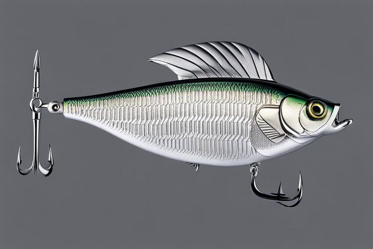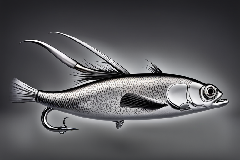 Stable Diffusion AI Prompt Fishing lure precisely mimics the exact shape and colors of a (((Silver Bass))). A panoramic studio shot of the highly detailed Silver colored ((Bass-shaped)) fishing lure with treble hooks designed to catch fish, centered product photography. A masterpiece product photo on a (black background).