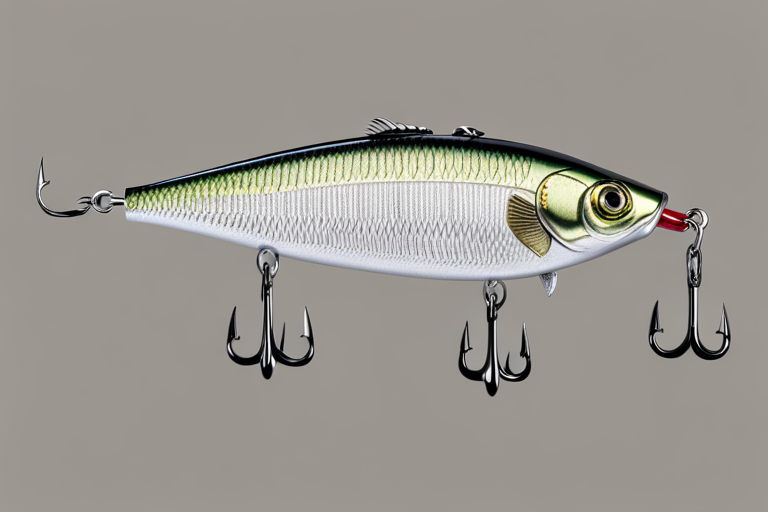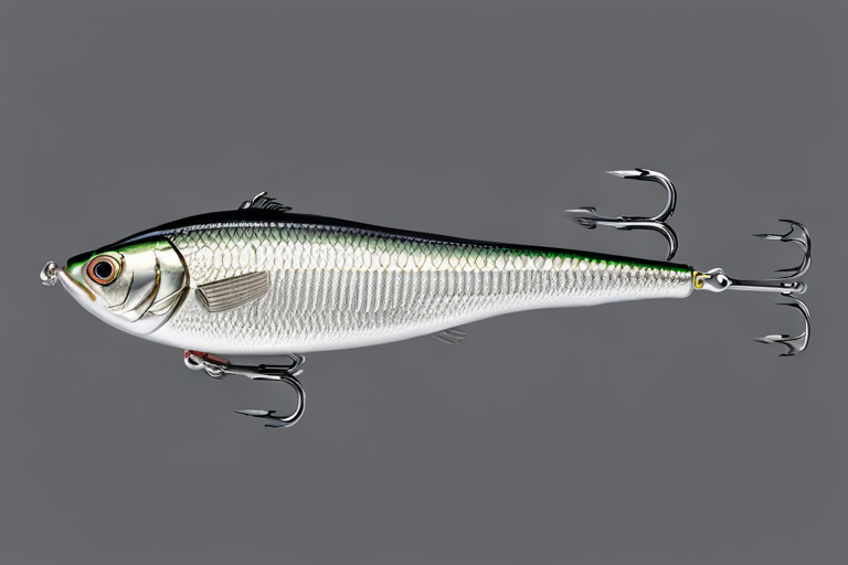 Stable Diffusion AI Prompt Fishing lure precisely mimics the exact shape and colors of a (((Silver Bass))). A panoramic studio shot of the highly detailed Silver colored ((Bass-shaped)) fishing lure with treble hooks designed to catch fish, centered product photography. A masterpiece product photo on a (black background).