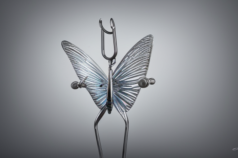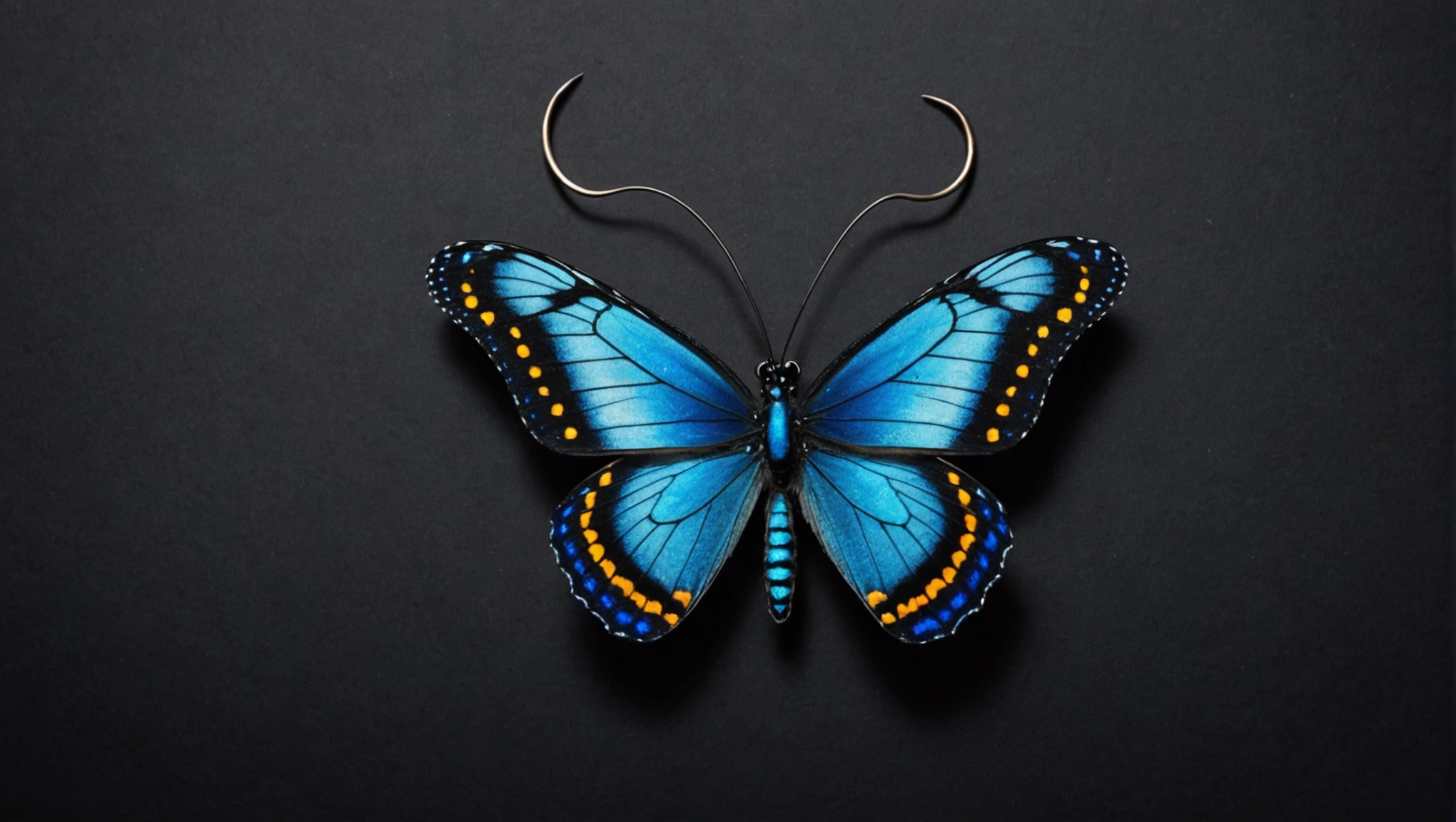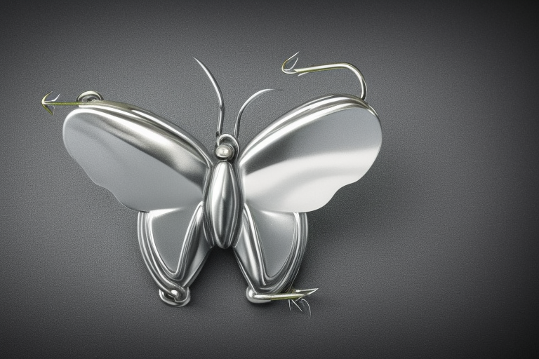 Stable Diffusion AI Prompt product photography of a fishing lure with hooks that looks like a Silver colored Butterfly!!!, (anatomically correct), futuristic, uhd, highly detailed, concept, product studio shot, panoramic shot, centered!!!, diffused lighting on a plain dark background, highly detailed, masterpiece, product photography by Jovana Rikalo