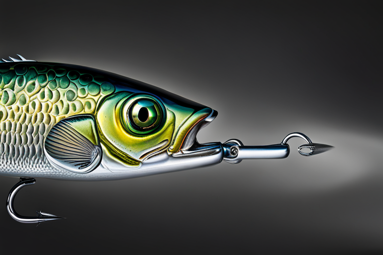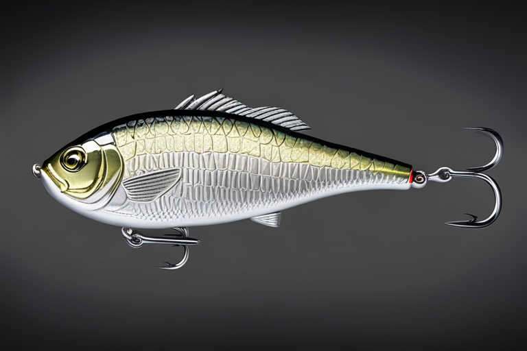 Stable Diffusion AI Prompt Fishing lure precisely mimics the exact shape and colors of a (((Silver Crappie))). A panoramic studio shot of the highly detailed Silver colored ((Crappie-shaped)) fishing lure with treble hooks designed to catch fish, centered product photography. A masterpiece product photo on a (black background).