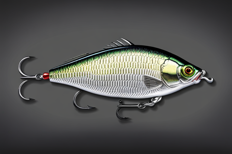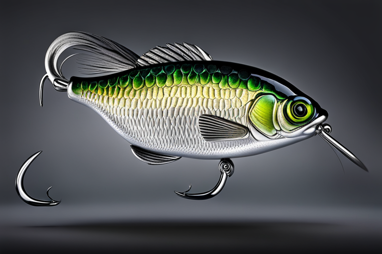 Stable Diffusion AI Prompt Fishing lure precisely mimics the exact shape and colors of a (((Silver Crappie))). A panoramic studio shot of the highly detailed Silver colored ((Crappie-shaped)) fishing lure with treble hooks designed to catch fish, centered product photography. A masterpiece product photo on a (black background).
