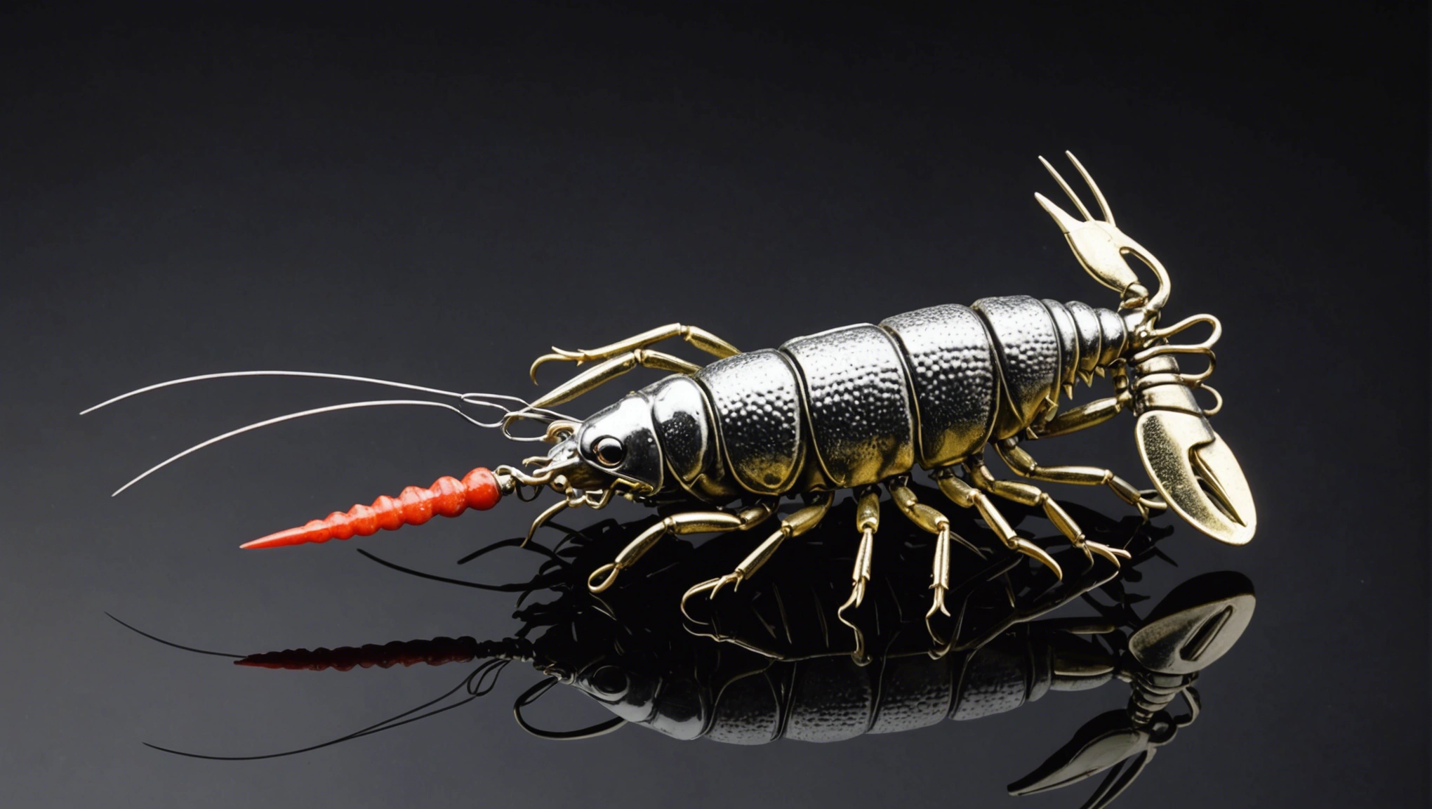 Fishing lure with fishing hooks like (((Silver Crawfish))). A studio shot masterpiece lure product photo centered on a (black background).