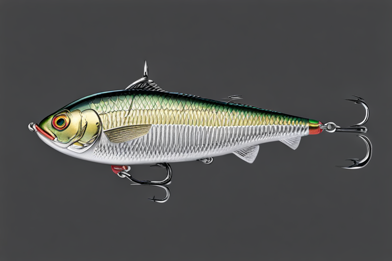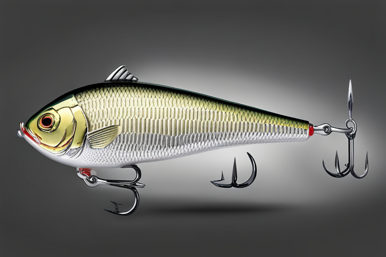 Stable Diffusion AI Prompt Fishing lure precisely mimics the exact shape and colors of a (((Silver Perch))). A panoramic studio shot of the highly detailed Silver colored ((Perch-shaped)) fishing lure with treble hooks designed to catch fish, centered product photography. A masterpiece product photo on a (black background).