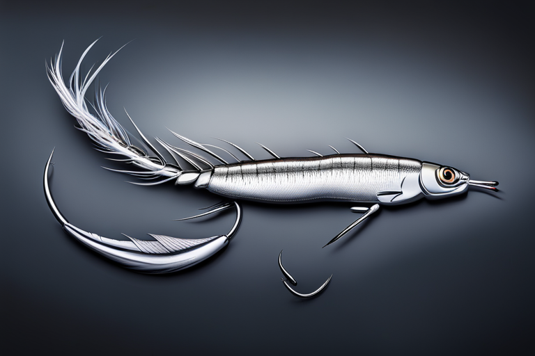 Stable Diffusion AI Prompt Fishing lure precisely mimics the exact shape and colors of a (((Silver Prawn))). A panoramic studio shot of the highly detailed Silver colored ((Prawn-shaped)) fishing lure with treble hooks designed to catch fish, centered product photography. A masterpiece product photo on a (black background).